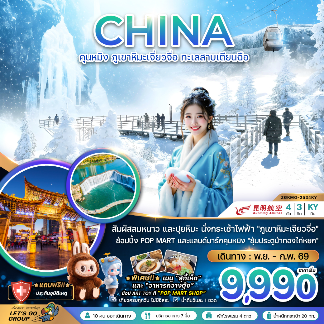 สนามบินสุวรรณภูมิ - สนามบินเฉิงตู – อุทยานภูเขาหิมะวาวู่ซาน – นั่งกระเช้าไฟฟ้า สุกี้ หม่าล่า - เมืองเฉิงตู – ซอยกว้างซอยแคบ – Global Center – น้ำพุไม้ไผ่ – ตึกแฝดเฉิงตู ปลาต้ม ผักกาด - วัดต้าฉือ – ถนนคนเดินชุนซีลู่ – แพนด้ายักษ์ปีนตึก – POP MART – สนามบินเฉิงตูเทียนฟู่ – สนามบินสุวรรณภูมิ